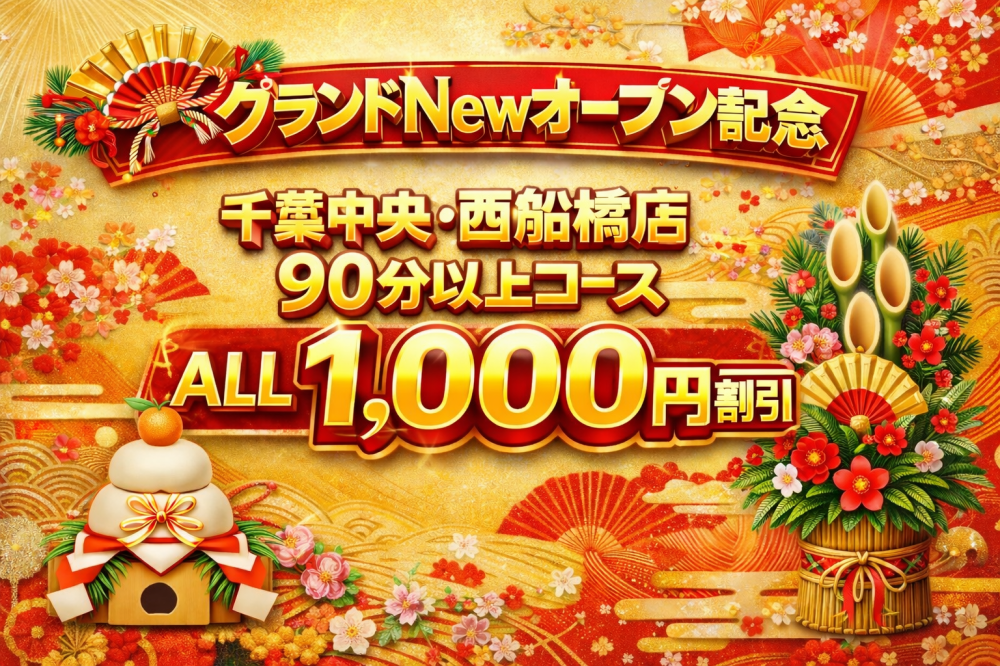 千葉中央店/西船橋店 共通90分以上のコースが👉 ALL 1,000円割引‼️年始の疲れ、ここでリセット💖今だけの特別価格で、極上の癒しをご体感ください💓